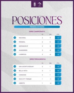 • Nacional (Femenino) ocupa la primera posición, seguida por Peñarol (Femenino) en el segundo lugar.